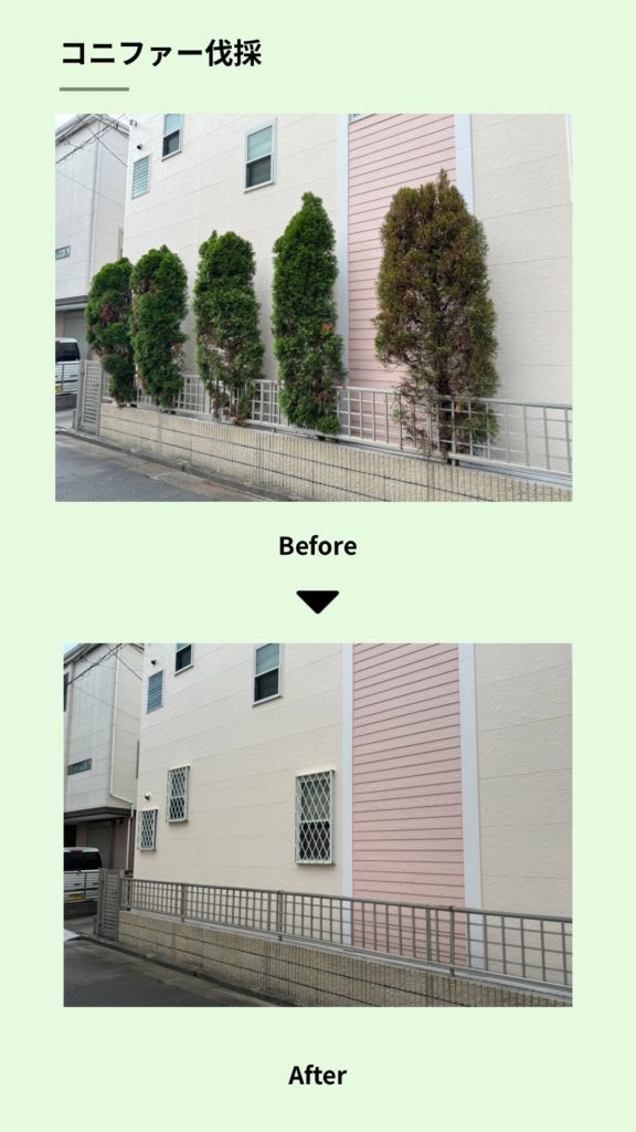 今回は、建物横に植えられたコニファーの伐採を行いました。
