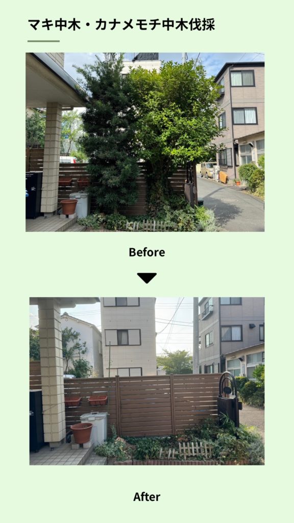 今回は、お庭のスペースをすっきりさせたいとのご依頼で、マキとカナメモチの中木を伐採いたしました。