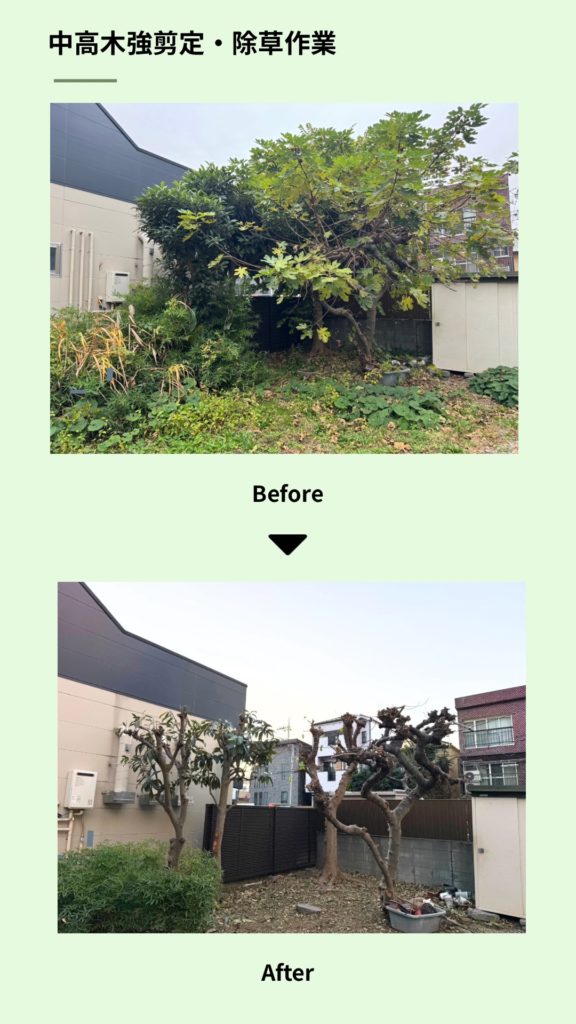 今回は中高木の強剪定と、敷地内の除草作業を行いました。